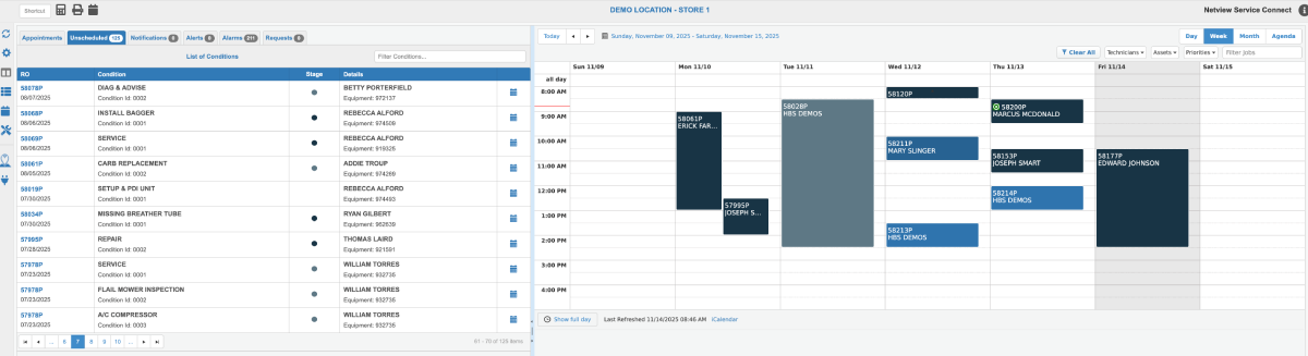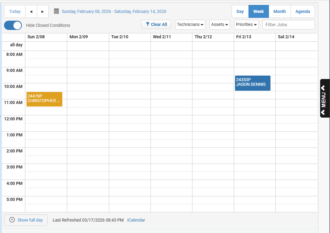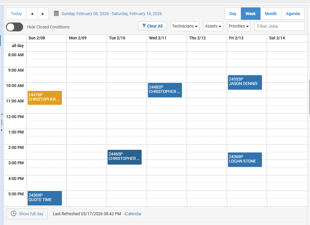 Optional user interface toggle adds the ability to reduce the number of items showing in the calendar view in Service Connect (SC). In the image on the left below, the full Service Connect calendar is present. The right view toggles off closed conditions, reducing visual clutter: